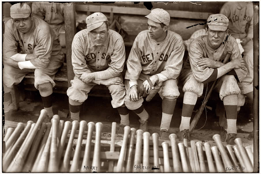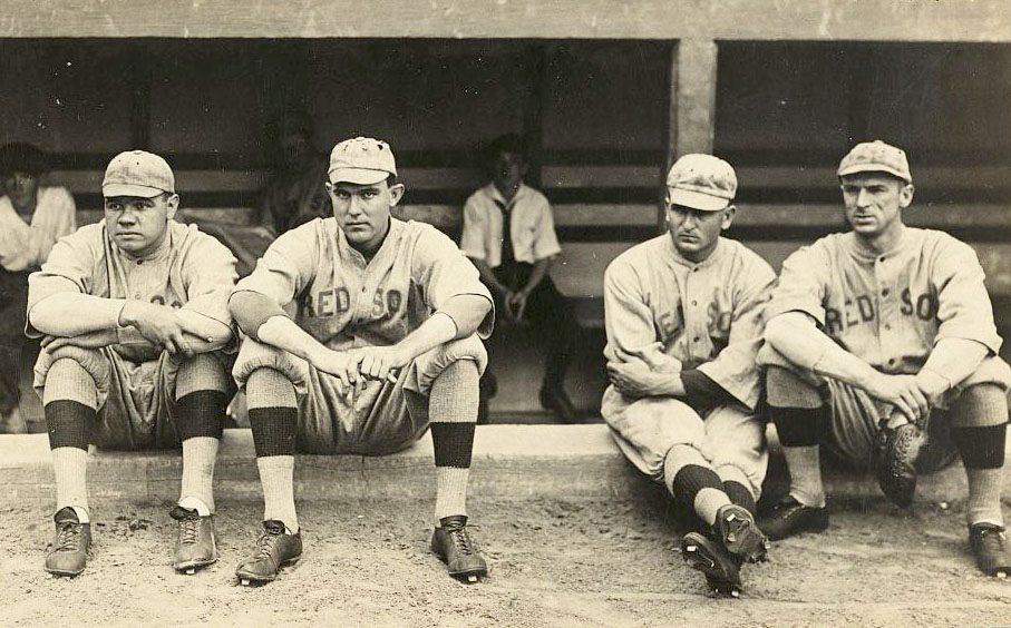 L-R: Unidentified, Vean Gregg, Dutch Leonard, Carl Mays, Babe Ruth, Rube Foster, Smoky Joe Wood, Ernie Shore, Ray Collins, Ralph Comstock, Everett “Deacon” Scott.