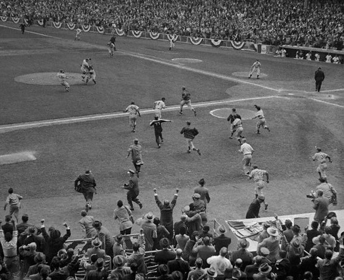 The photo above is from October 4, 1955 as Dodger pitcher Johnny Podres jumps for joy after Elston Howard grounds out to PeeWee Reese. Catcher Roy Campanella converges on the mound to celebrate the final out in Game Seven of the 1955 World Series. The Dodgers had finally beaten the Yankees in seven games and had won their first and only World Series title in Brooklyn.