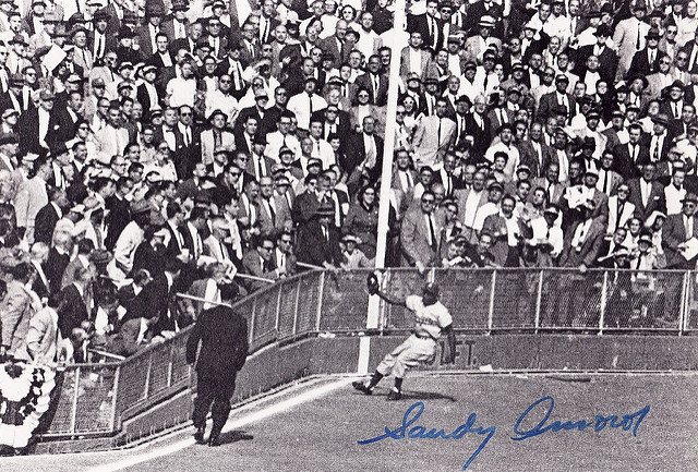 Game Six: The Dodgers scored one run in the fourth and sixth innings on a single and sac fly, both by Gil Hodges. With runners on first and second and one out, left fielder Sandy Amorós made a dramatic game-saving catch of a deep fly ball down the left field line off the bat of Yogi Berra in the sixth inning, to start a double play.