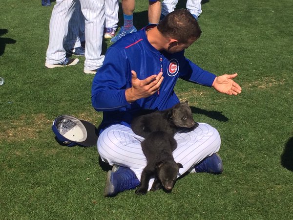 The Chicago papers today are full of stories about the Cubs bringing “real cubs” to their camp in Mesa, Arizona. According to the story, first baseman Anthony Rizzo quickly developed a bond with them – at least until one of them peed on him! That’ll teach Rizzo a lesson in handling wild animals. Hey Anthony…Guess what?…Baby bear cubs aren’t house-broken! Haha!