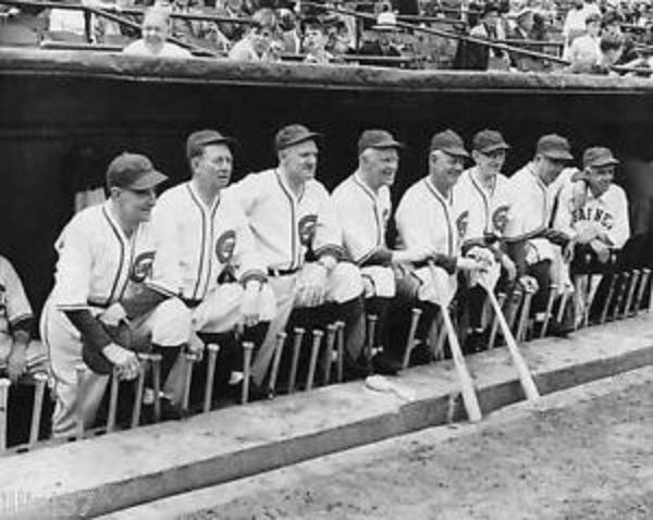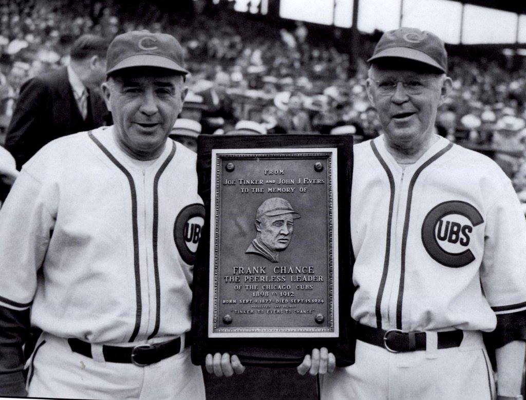 Thankfully, the feud eventually had a happy ending. In the great photo above, we see Joe Tinker and Johnny Evers reunited in 1937 at an Old-Timers game played at Wrigley Field. On that day, they dedicated a plaque to the memory of their deceased manager, Frank Chance, who had died in 1924. Here’s the heart-warming caption I found with the photo: