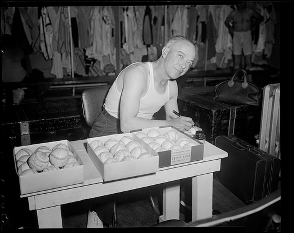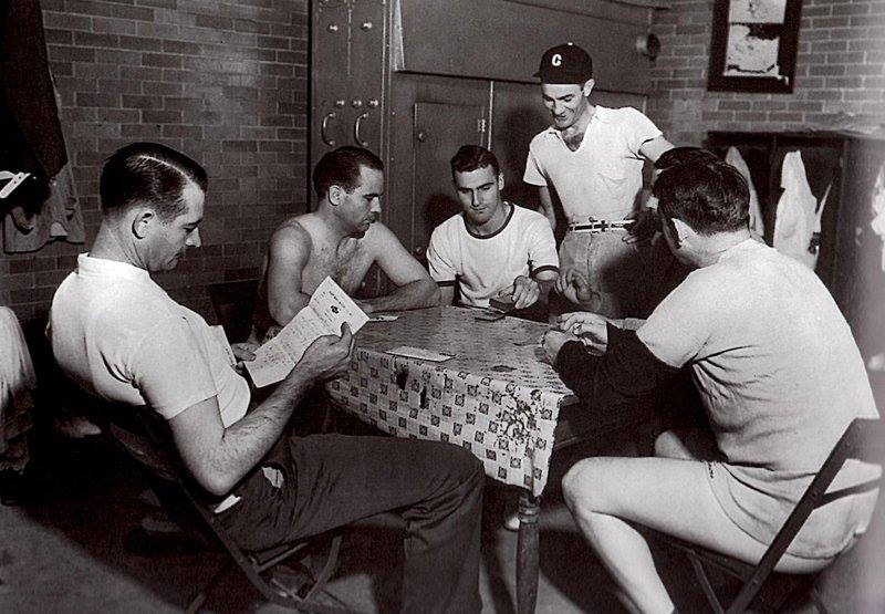 Here’s a photo from the Boston Red Sox clubhouse in Fenway Park vintage 1928. Check out all the details of what a clubhouse from years ago actually looked like. I believe that’s a cast iron furnace and the trainer, Bits Bierhalter, is taking out a “hot stone.” Must have been a cold day in Boston! Quite a contrast from today’s luxury clubhouses and lavish weightrooms.