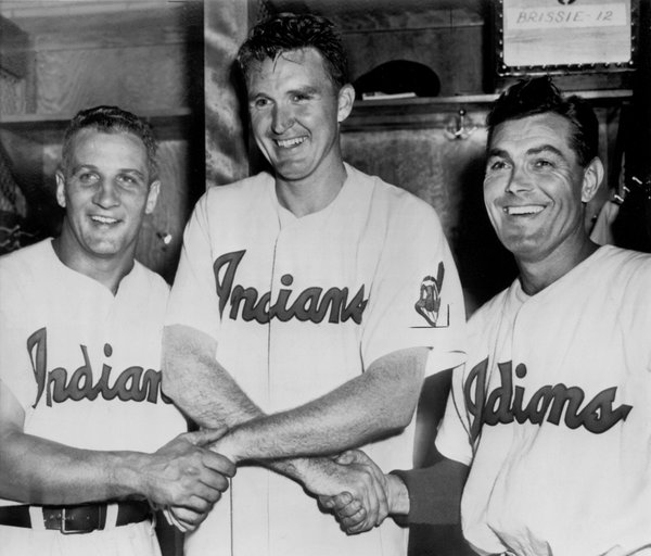 In the featured photo above, we see Lou Brissie, center, with Indians’ teammates, Al Rosen and Hank Majeski