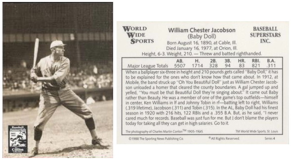 The son of Swedish immigrant parents, William Chester Jacobson played 11 seasons in the majors, principally with the St. Louis Browns, between 1915 and 1927. He also played for the Tigers (1915), Red Sox (1926–1927), Indians (1927), and Athletics (1927). Over his career, he hit .311 (97th all-time), with 83 home runs, 818 RBIs, 86 stolen bases, and a .357 on-base percentage. He struck out only 410 times in 6,067 plate appearances. A big man at 6’ 3”, 215 pounds, Baby Doll was actually bigger than Babe Ruth.