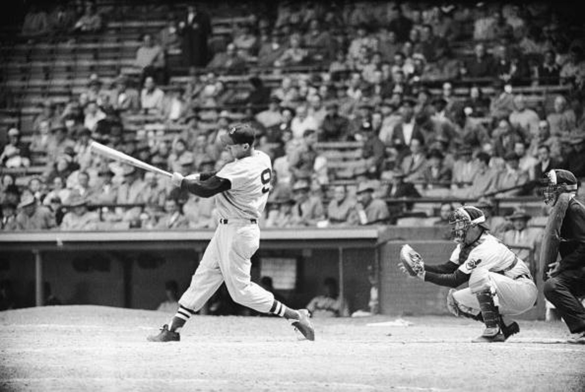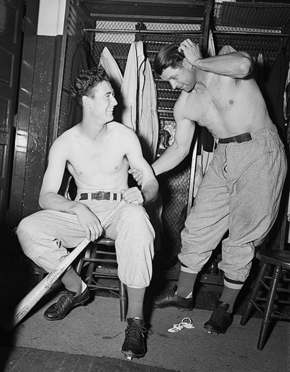 Here we see the great slugger scratching his head, trying to figure out how his scrawny young teammate named Ted Williams generates all his power! He can quite figure it out…and, quite frankly, looking at William’s’ biceps, I’m wondering the same thing! How did he manage to hit 521 home runs with those arms??