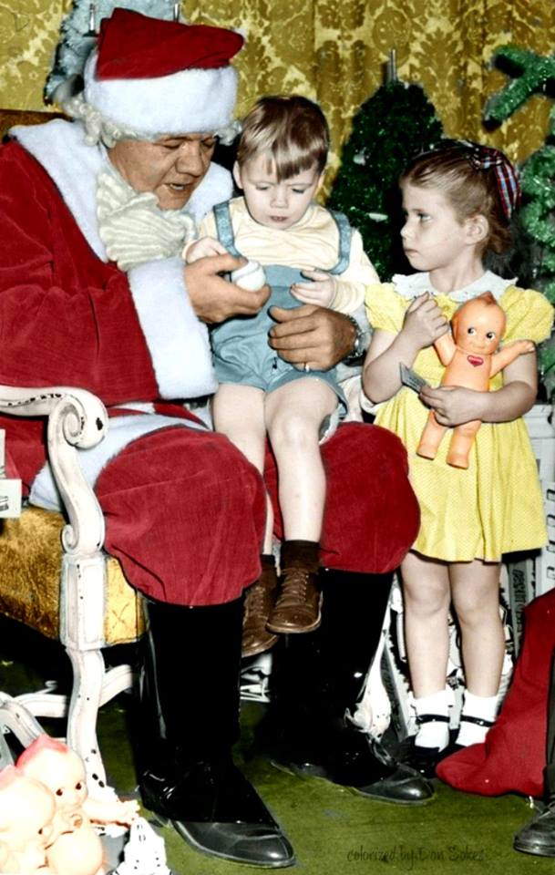 What could be a more fitting way for all of us who love baseball history and old baseball photos to celebrate the Christmas season than with this beautiful Babe Ruth colorization by Don Stokes. I included a link to the actual footage of the event where Babe played Santa for 50 polio victims at the Astor Hotel in New York. I’m not sure how the kids reacted to seeing Babe’s beard falling off, though. From the look on the little girl’s face in the photo, she apparently wasn’t sure what to make of it. Oh well, that’s the Babe!