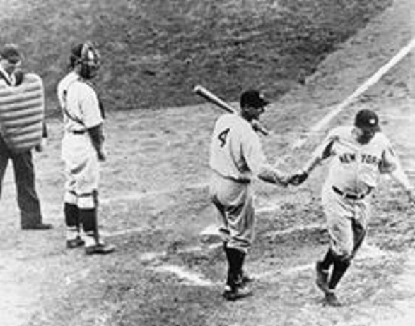 (In the featured photo above, we see Lou Gehrig shaking Babe’s hand as Cubs’ catcher Gabby Hartnett and umpire Roy Van Grafian watch him cross the plate after his “Called Shot.”)