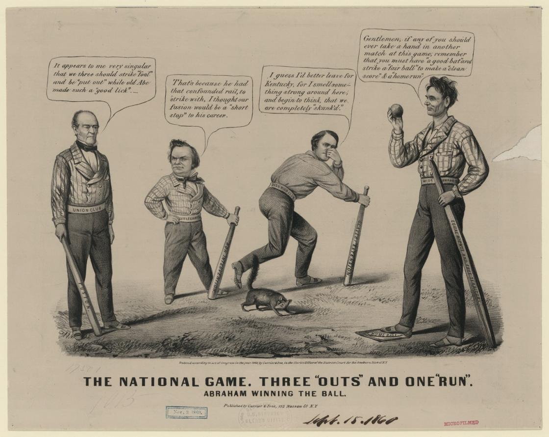 - Even before the war, Americans used terms and imagery from baseball to explain and describe events in other arenas of life. One 1860 political cartoon [shown in the gallery], depicts that year’s four presidential candidates as baseball players, with Lincoln emerging victorious.