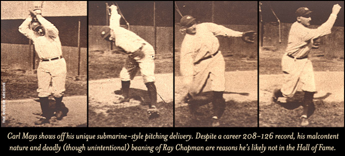 Carl Mays, in contrast, was a surly, mean-spirited sort who had few friends in the game. A noted head-hunter with an exaggerated submarine delivery, he sometimes scraped his knuckles across the mound as he followed through with his deceptive motion. He was often among the league-leaders in hit batsmen.