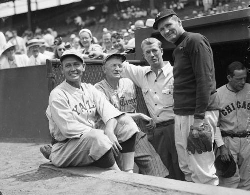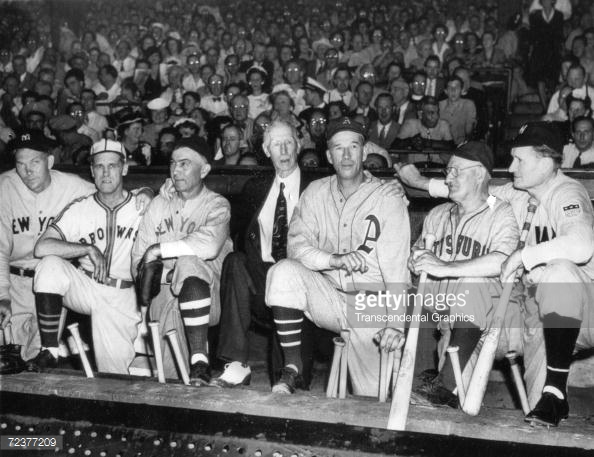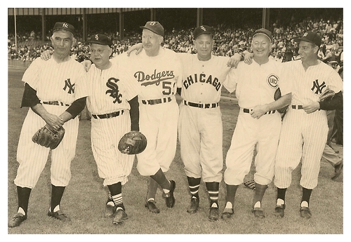 Plus…what really caught my attention, Bill chose to feature on the very first edition of his new blog one of my favorite Old-Timers photos. It’s from the 1943 War Bond game. Here’s the player IDs: