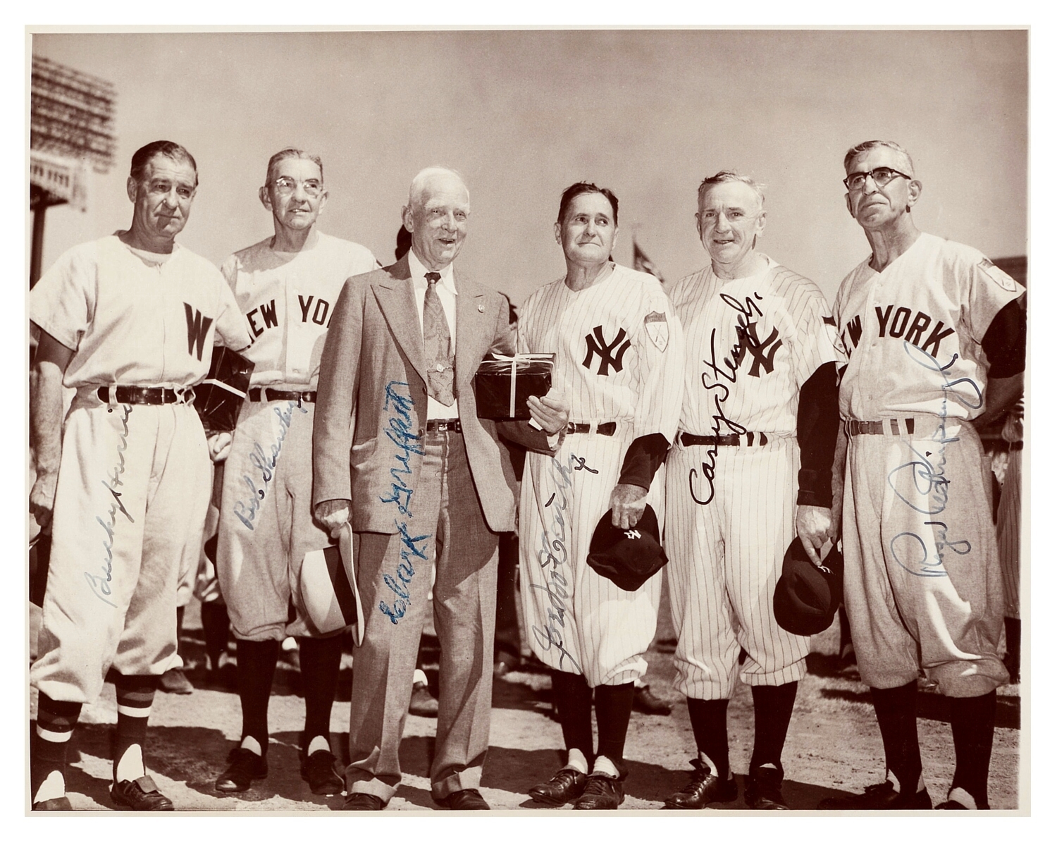 Top: Duffy Lewis, Eddie Collins, Roger Bresnahan, Connie Mack, Bill Klem, Red Murray, George Sisler. Front: Honus Wagner, Frankie Frisch, Babe Ruth, Walter Johnson, Tris Speaker.