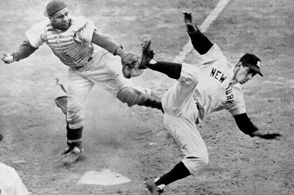 Martin had his first significant playing time in the 1952 World Series against the Dodgers where his sixth-inning three-run homer propelled the Yanks to a 7-1 victory in Game Two. But what he is most remembered for in that Series was his spectacular grab of a wind-blown pop-up in the seventh inning of game seven. With New York nursing a 4-2 lead in that pivotable game, Jackie Robinson came up with the bases loaded, two outs, and lofted a short infield pop-up that confused all the Yankee infielders and seemed certain to drop scoring the tying runs. But Martin came out of nowhere to make a lunging grab by the pitcher’s mound to save the day for the Yanks (see featured photo).