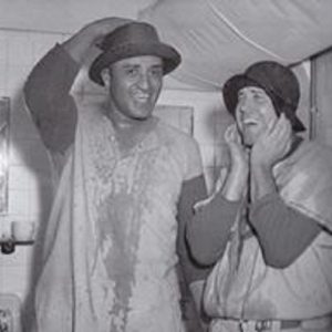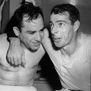 Yogi Berra and Joe DiMaggio celebrate in the Yankee clubhouse.