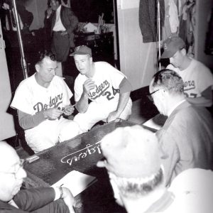 Gil celebrates in Dodger clubhouse with Jackie Robinson and Sal Maglie