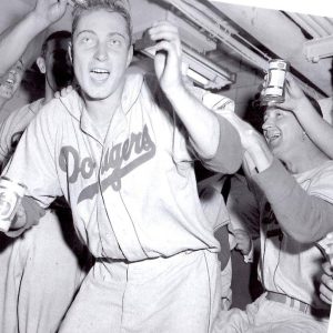 Johnny Podres celebrates in the Dodgers' clubhouse