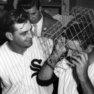 Ted Kluszewski and Early Wynn celebrate White Sox win in clubhouse