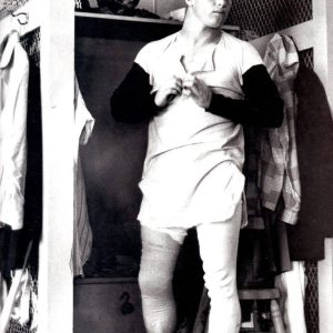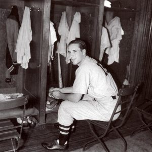 Bob Feller sits in front of his locker in Indians clubhouse