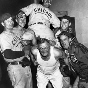 Celebration in Cub clubhouse in 1945. Trainer Andy Lotshaw holds up Charlie Grimm.