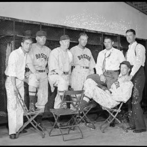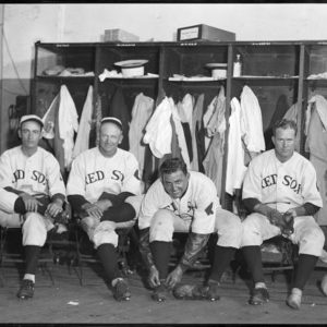 Red Sox clubhouse;:Bits Bierhalter, Moe Gottlieb, Johnny Orlando