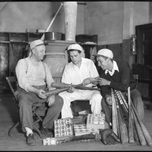 Red Sox players in clubhouse. L-R: Ed 'Bull' Durham, Wilcy Moore, Bob Kline and Paul Ivy Andrews