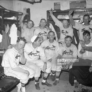 Cardinals in the clubhouse: Lon Warneke, Dick Siebert, Ray Harrell, Herb Brenner, Jimmy Brown, Bill McGee, and Pepper Martin in the middle.