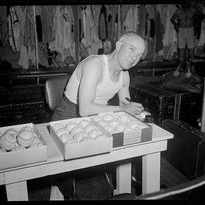 In the featured photo from the Leslie Jones Boston Public Library collection, we see a scene from the Red Sox clubhouse at Fenway Park, vintage 1928. Check out all the details of what a clubhouse from years ago actually looked like. I believe that’s a cast-iron furnace and the trainer, Bits Bierhalter, is taking out a “hot stone.” Must have been a cold day in Boston! Quite a contrast from today’s luxury clubhouses and lavish weight rooms (see photo gallery).