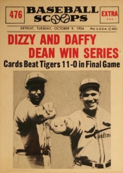 Dean was best known for leading the 1934 St. Louis Cardinals’ “Gashouse Gang.” He went 30–7 with a 2.66 ERA, and then started and won two games in the World Series. He followed this with 28-12 (3.04) in 1935, and 24-13 (3.17) in 1936. The Cardinals were the southernmost and westernmost team in the major leagues and the “Gashouse Gang” became de facto “America’s Team.” Southerners, such as the Dean brothers and Pepper Martin, became folk heroes in Depression-ravaged America, who saw in these players – dirty and hustling rather than handsome and graceful – a spirit of hard work and perseverance, as opposed to the haughty, highly paid New York Giants.