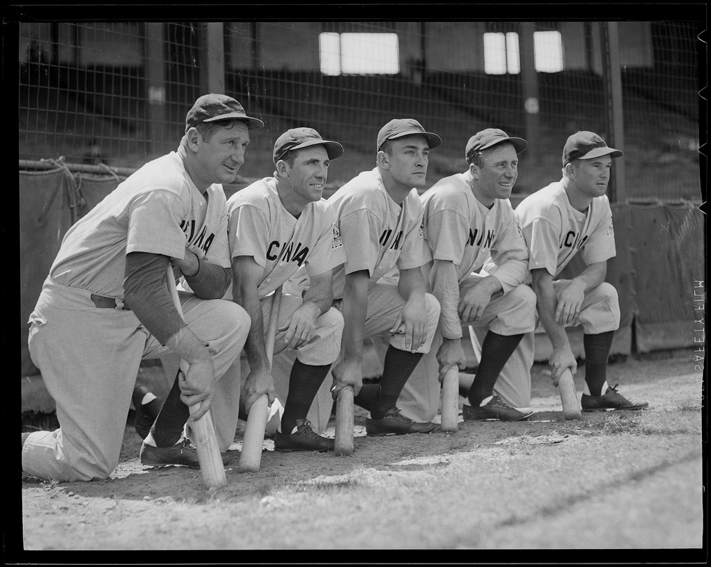 My recent post about the 1939 Yankees got me to thinking about their National League opponents in the 1939 World Series: the Cincinnati Reds. So to give them a little equal time, here’s a nice photo of Hall-of Fame catcher Ernie Lombardi and four of his teammates from the 1939 pennant-winning Reds. They lost to the Yankees in the World Series 4-0 that year, but came back to win the pennant and World Series the following year, beating the Tigers.