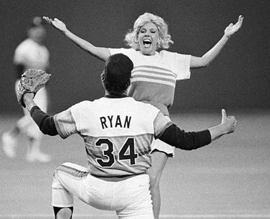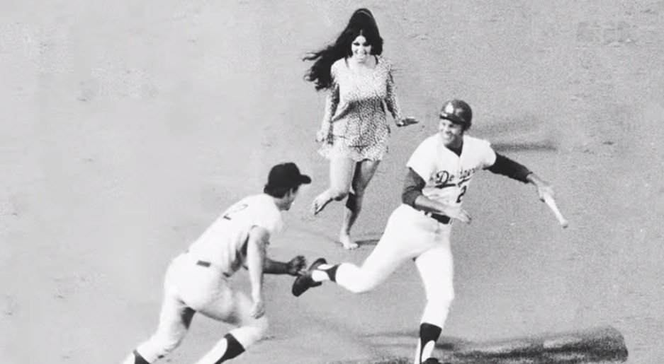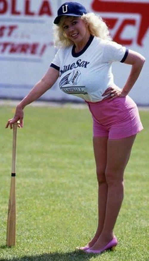 What happened next took everyone in the stadium by complete surprise. An attractive 23-year old exotic dancer, Morganna Roberts, better known as “Morganna the Kissing Bandit,” leaped over the fence, bolted on to the playing field, and made a bee-line for the startled Clete Boyer standing at home plate.