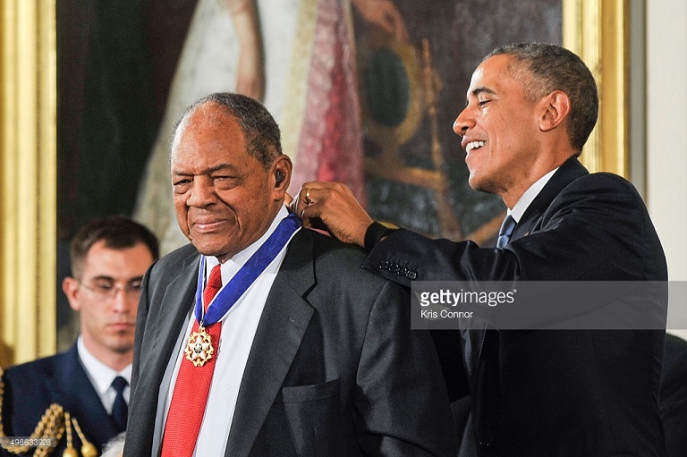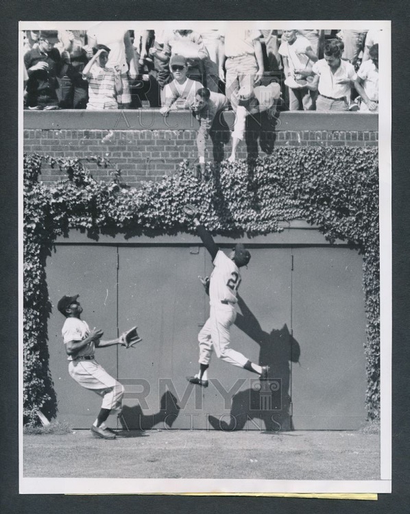 Mays was in the Army during the Korean War for most of the 1952 and all of 1953. With those years, Willie almost certainly would have broken Babe Ruth’s lifetime home run record. Upon his return in 1954, all he did was lead the league with a .345 batting average and a .667 slugging percentage, hit 41 homers, and win the MVP Award, leading the Giants to the pennant and World Series championship. Of course then there’s “The Catch,” saving Game One of the 1954 World Series for the Giants. After a long run to the deepest part of the cavernous Polo Grounds – with his cap flyng off his head – he made an unbelievable over-the-shoulder catch over 420 feet from home, robbing Vic Wertz of at least a triple. It has become one of the most memorable plays in major league baseball history. Willie later said he made lots of other catches that were even better!