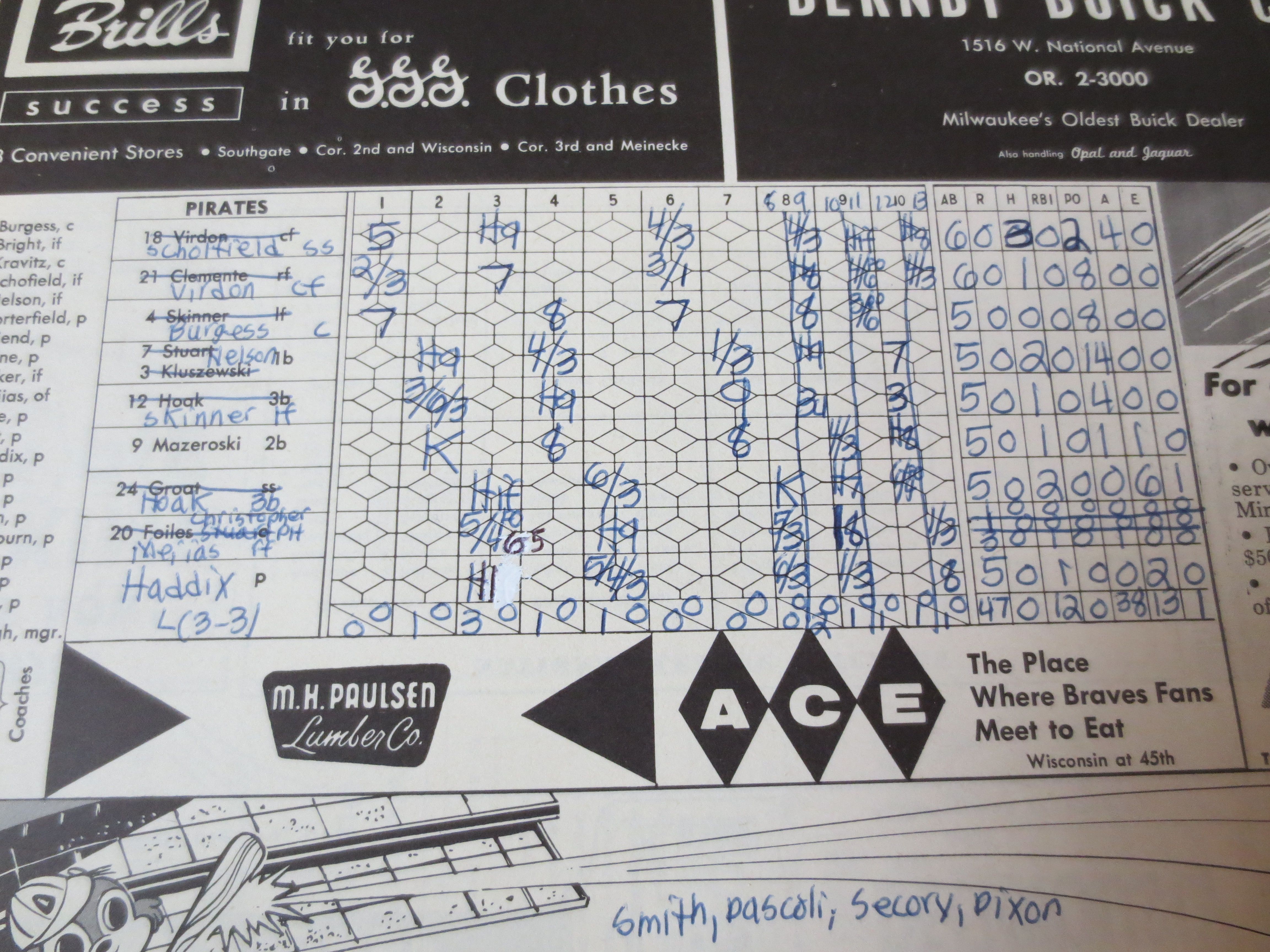 Haddix retired 36 consecutive batters that day essentially relying on just two pitches: his fastball and slider. The problem for Haddix and the Pirates was that the Braves’ pitcher, Lew Burdette, was also having a great day, taking a shutout into the 13th, scattering 12 singles without walking a batter. The Braves’ lineup was stacked with heavy hitters, including Eddie Mathews, Hank Aaron, Joe Adcock, Wes Covington, and Del Crandall. They had won the National League pennant in the previous two years.