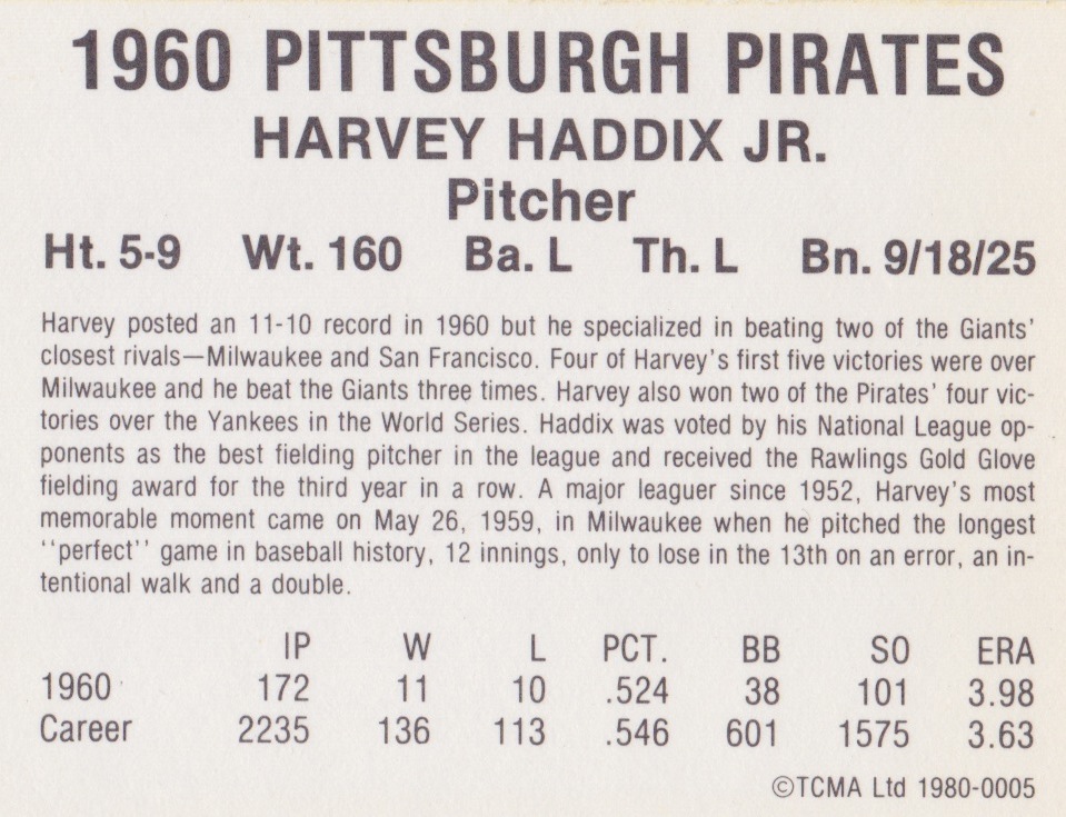 “Not a day goes by that somebody doesn’t ask me about that game. I think I got more notoriety from it because I lost.”-Harvey Haddix, years later reflecting on his historic game