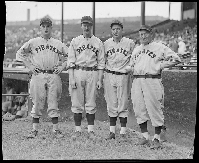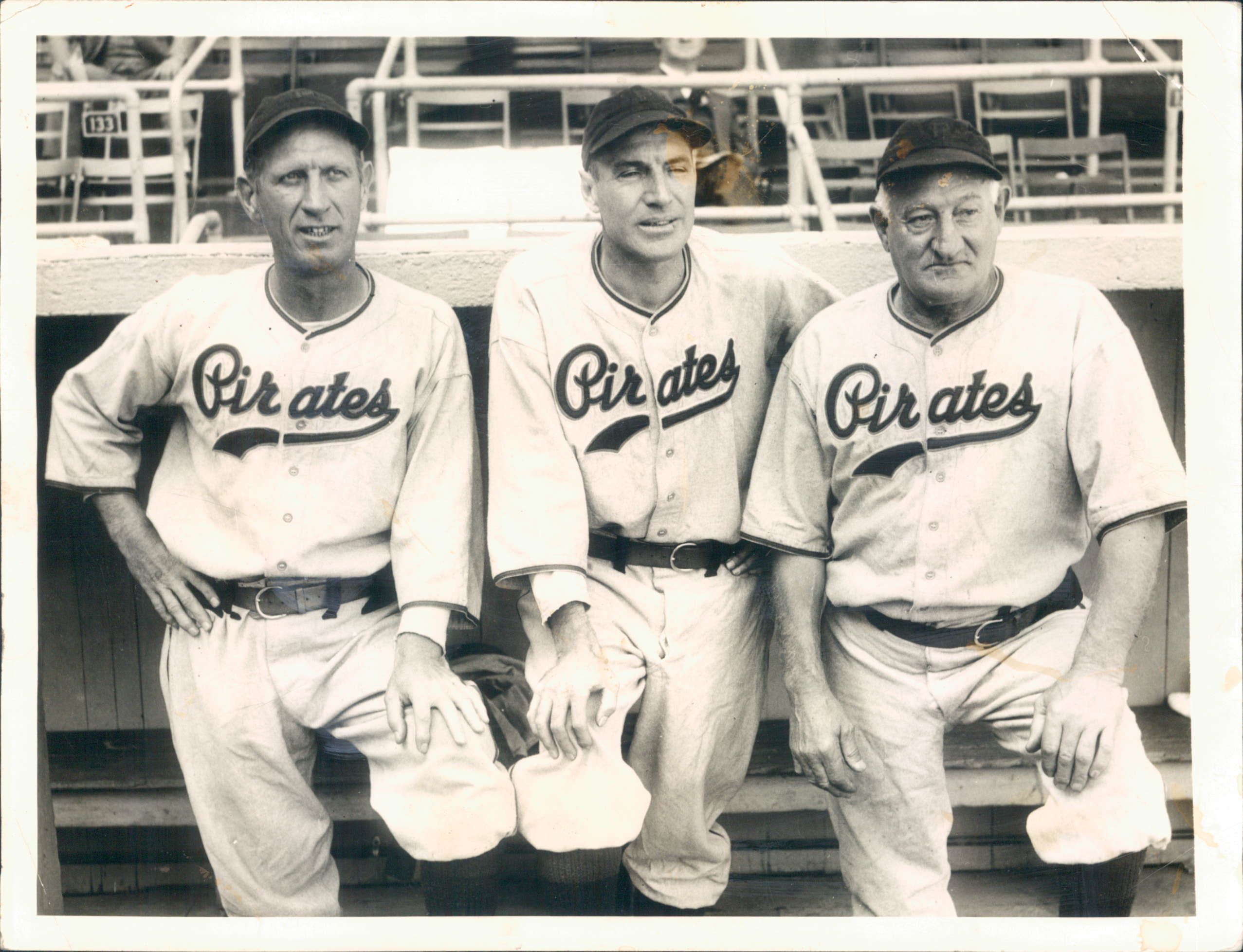 Recognize the “Old-Timer” on the right? I’m sure you do…it’s none other than the great Honus Wagner in one of his many seasons as a Pirates’ coach. Not sure of the exact year,but it’s probably from about 1942-46. He’s giving batting tips to a couple of young Pirate “whippersnappers.” On the left is Jim Russell, who played for the Bucs from 1942-51; and on the right is Frank Colman, a Pirate from 1942-46.(Be sure to click on the photo for a much better look).