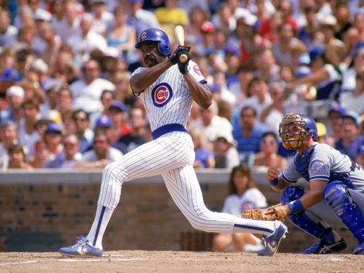 Andre Dawson wearing the pin stripes of a Cub uniform.