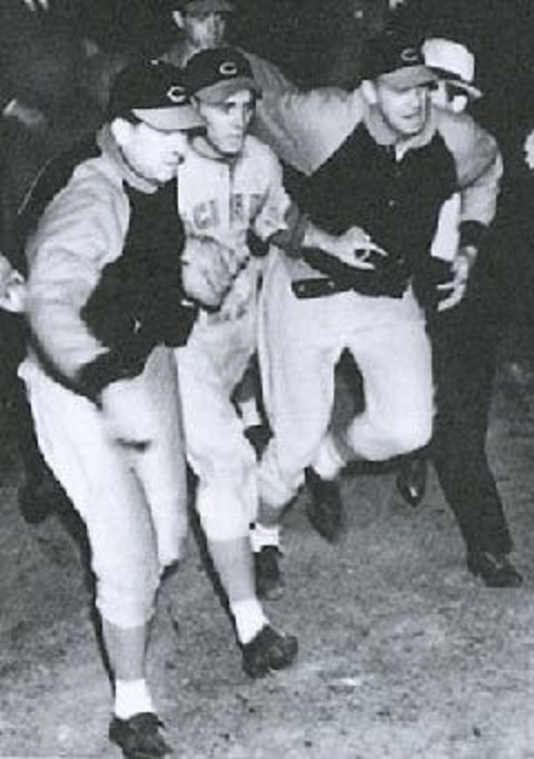 The scene before the second game on June 15, 1938, was entirely different. 38,748 fans packed into Ebbets Field for the first night game in Brooklyn history. The pre-game festivities, staged by Brooklyn GM Larry MacPhail, included a band and a drum and bugle corps. Jesse Owens was invited to put on an exhibition of his track skills, running a 100-yard dash against Ernie Koy of the Dodgers and Lee Gamble of the Reds. Recently retired Babe Ruth was on hand to congratulate Vander Meer. The Babe received a royal welcome as he appeared on the field during the Dodgers’ infield practice. The mayor of Midland Park, New Jersey – Vander Meer’s hometown — presented Johnny with a gold watch. With all the delays the first pitch didn’t come until 9:45 after the starting pitchers had warmed up three times!