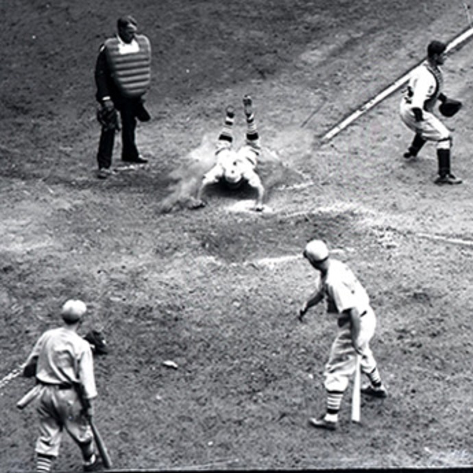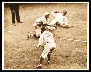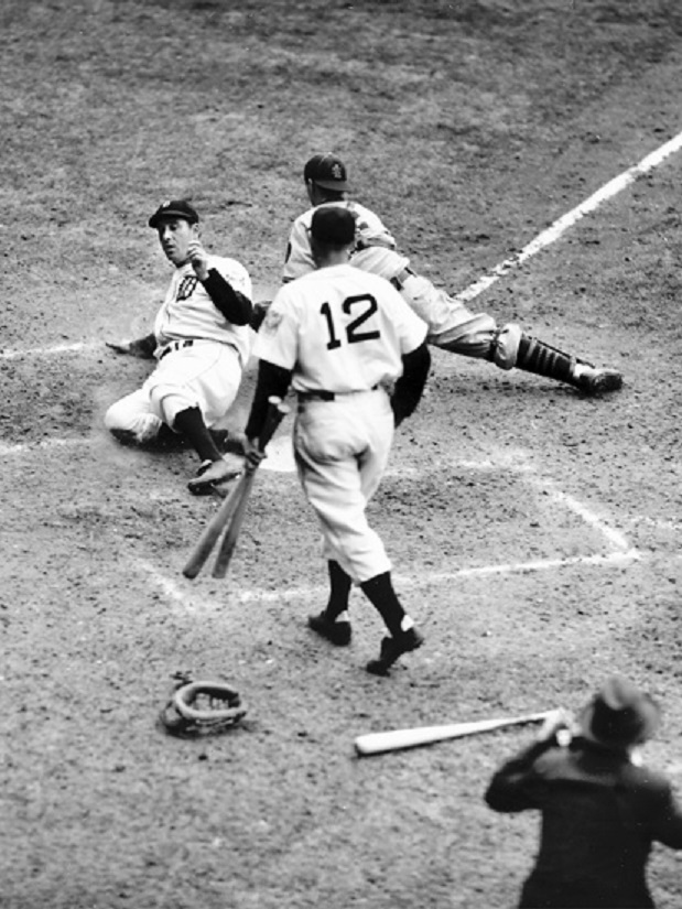 In the classic photo below from Game Six of the 1934 World Series, played on October 8, 1934, we see the Cards’ Jack Rothrock sliding home safely under a leaping Mickey Cochrane of the Tigers as teammate Rip Collins looks on. Hall-of-Fame umpire Bill Klem is ready to make the call.