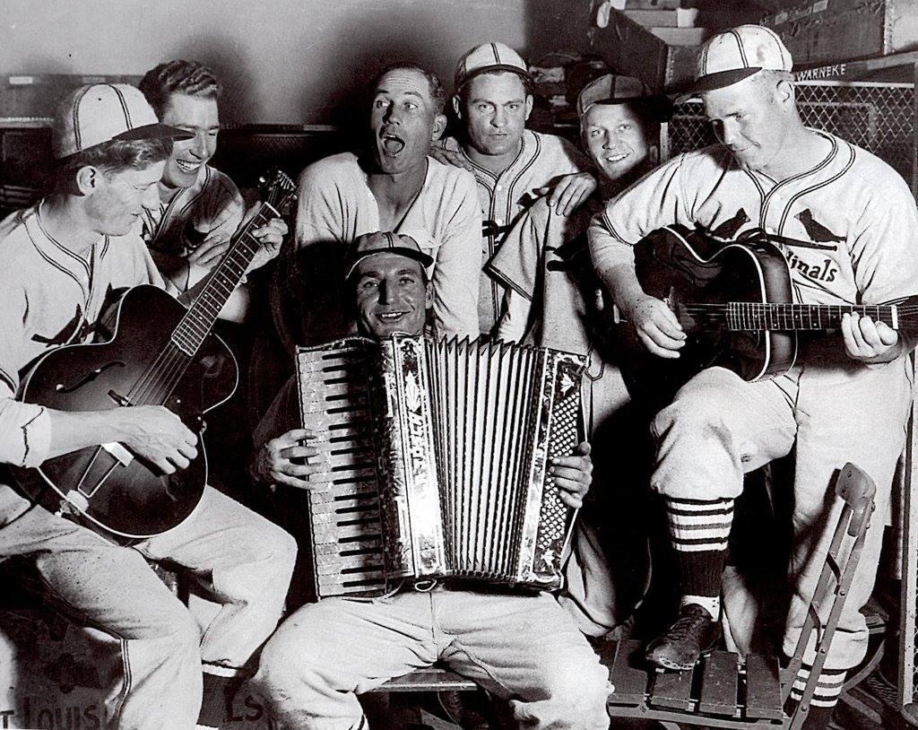 In the classic featured photo above, we see members of the “Gashouse Gang”: Dizzy Dean, Leo Durocher, Ernie Orsatti, Bill DeLancey, Rip Collins, Joe Medwick, Frankie Frisch, Jack Rothrock, Pepper Martin.