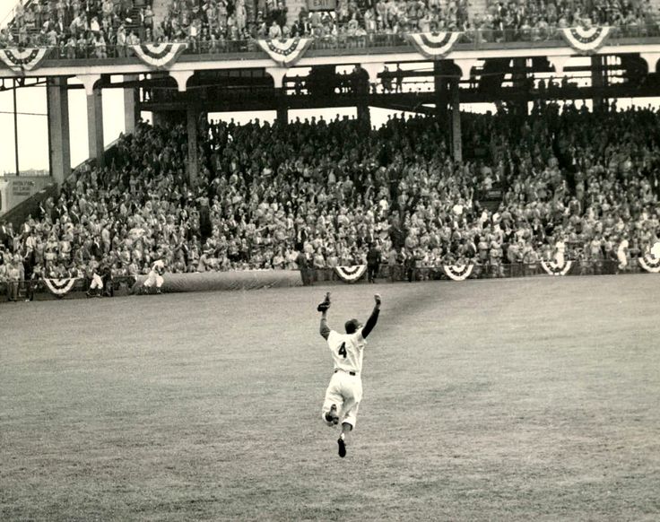 In the crucial seventh game, the Dodgers scored in the fourth when Campanella doubled and Hodges singled him home. In the sixth, Reese, Snider, and Furillo loaded the bases and Hodges’ sacrifice fly off Bob Grim brought in the second, and final run, of the game. Podres scattered eight hits and two walks, but the Yankees couldn’t score. The closest they came was Berra’s fly ball to left on which Sandy Amoros made a sensational catch – one of the most memorable plays in World Series history. The Dodgers entered the ninth with a two-run lead. Bill Skowron started the Yankees’ last at-bat by hitting one back to Podres for an easy out. Next Bob Cerv flied out to Amoros in left and Elston Howard then grounded to Pee Wee Reese who tossed to Gil Hodges to end the game. The Dodgers had finally beaten the Yankees for their first World Championship title.