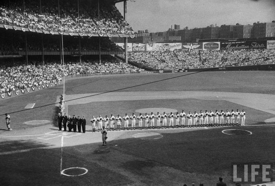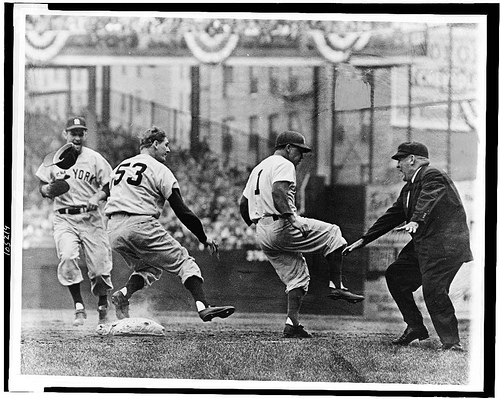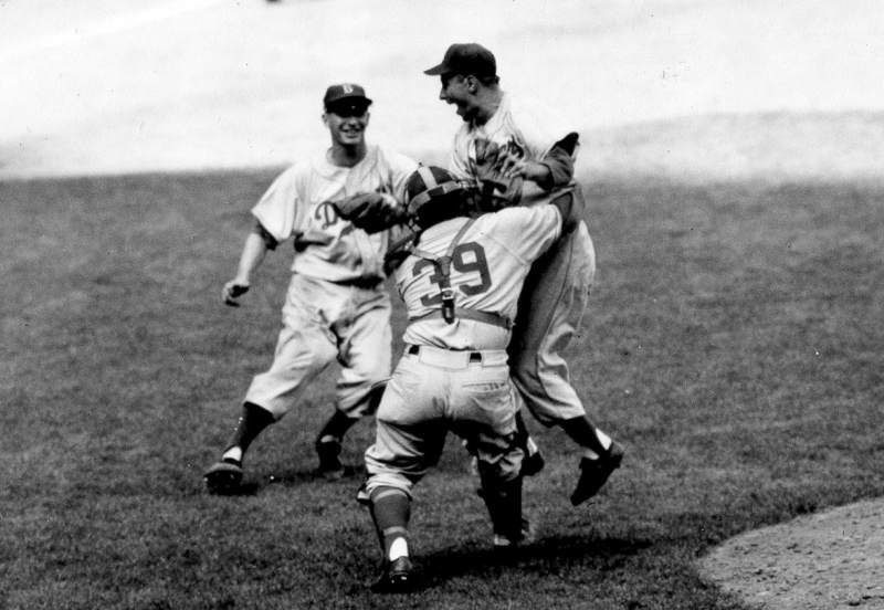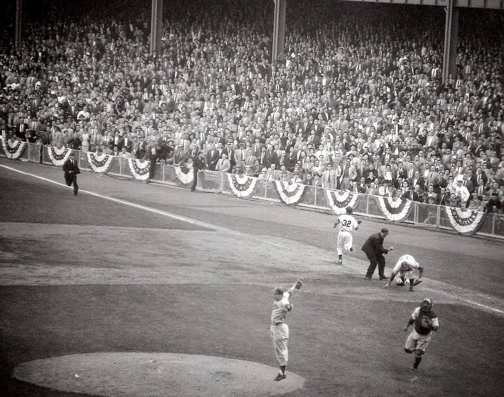 In the featured photo above, from October 4, 1955 we see Dodger pitcher Johnny Podres jumping for joy after Elston Howard grounds out to PeeWee Reese. Catcher Roy Campanella converges on the mound to celebrate the final out in Game Seven of the 1955 World Series. The Dodgers had finally beaten the Yankees and had won their first and only World Series title in Brooklyn.