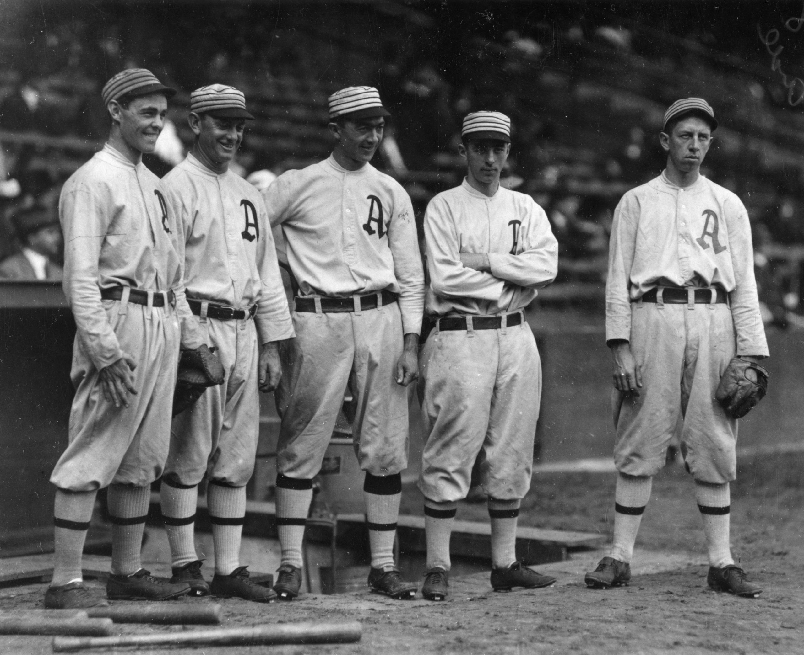 L-R: Frank Chance (HOF), Eddie Plank (HOF), Mordacai “Three-Finger” Brown (HOF), Harry Davis, Jimmy Sheckerd, and Jimmy Archer.