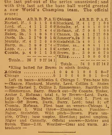 The Cubs went with their ace Mordecai Brown against the undefeated Coombs for Game Five. Both pitchers rose to the occasion and went neck and neck for seven innings. The A’s pulled ahead by a run before adding five more in the eighth on the way to a 7-2, Series-winning victory.