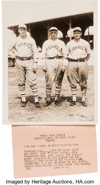 By now a fixture in the majors, in 1918 our wunderkind logged a .302 average, becoming one of just six regulars in the league to hit .300.  His big-league career had definitely been launched:  A young, hungry, and aggressive 21-year-old with a sharp batting eye, great speed on the bases and a cannon arm in right, he showed all the “hustle and desire” that would appeal to his like-minded and equally combative field boss.  Indeed, John McGraw, who later decided Dr. X “could do everything a baseball player should do, and do it better than most,” soon began grooming his protege to succeed him as the team’s manager, a planned destiny ultimately derailed by the cruelest of fates.  McGraw was so enamored of his cherished right-fielder, in fact, that he kept just two photographs on display in his office, our yet-to-be-identified world-beater was one. The second? None other than “Big Six,” the legendary Christy Mathewson himself.