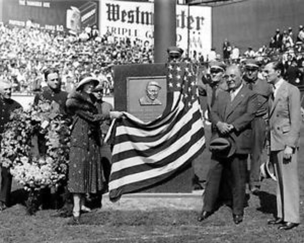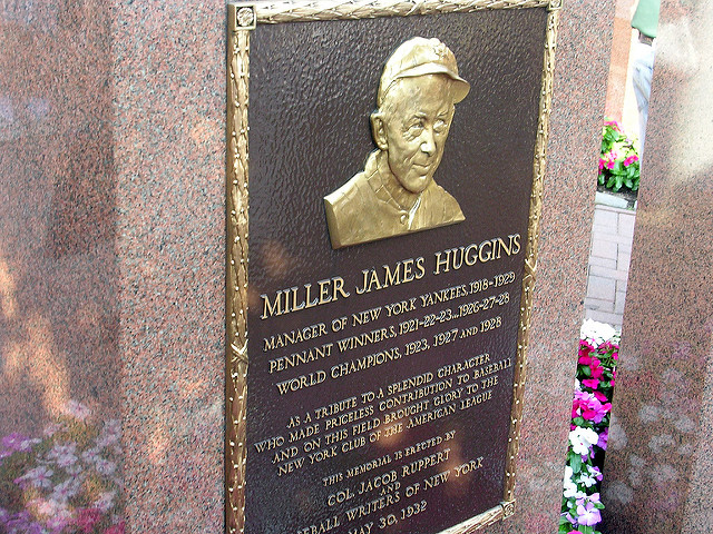 Huggins fell ill on September 20, 1929 with an infectious disease called erysiplas and checked into Saint Vincent’s Catholic Medical Center where he received blood transfusions. He died five days later, aged 51. The American League canceled its games the following day as thousands of tearful fans paid their respects at Yankee Stadium. A moment of silence was held before the start of Game Four of the 1929 World Series. The Yankees dedicated a monument to Huggins on May 30, 1932, placing it in front of the flagpole in center field in Monument Park. Miller Huggins was elected to the Hall of Fame in 1964.