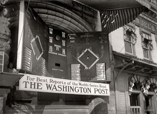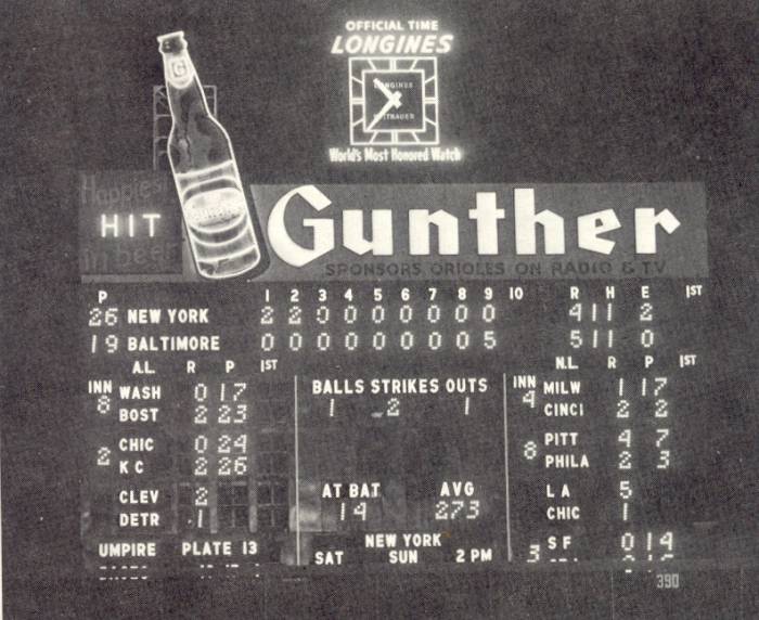 Actually, the red center is not the original paint scheme. When the board debuted the center was painted a lighter royal blue. It was in the mid-60’s the center was painted red and the Cubs game was added (in dark blue) below the new red Balls/Strike area. The original royal/navy version only had room for four NL games – so one was always missing. The red center version, by adding the Cubs, showed all AL and NL games.