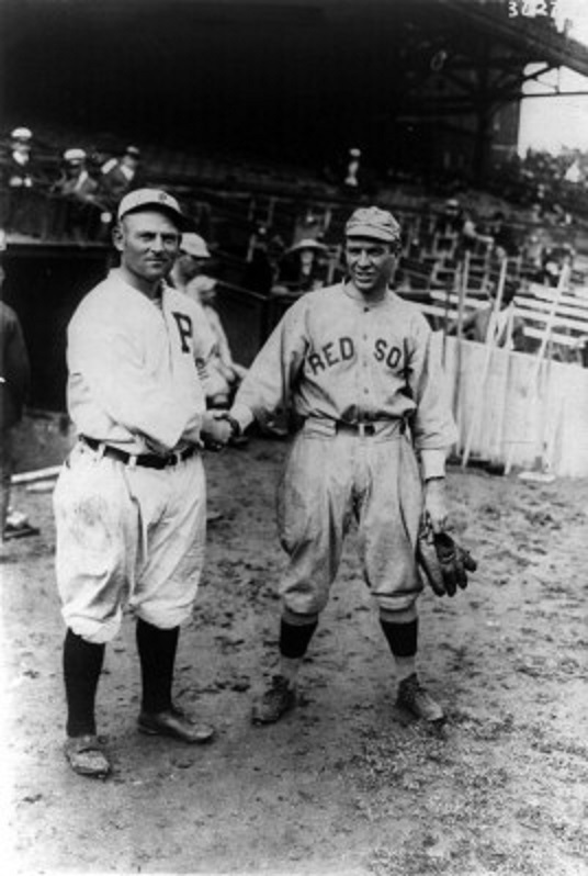 The 101-50 Red Sox pitching staff was loaded that year, with five starters winning 15 or more games for manager Bill Carrigan: Rube Foster: 19-8; Ernie Shore: 19-8; Babe Ruth: 18-8; Dutch Leonard: 15-7; and “Smoky Joe” Wood: 15-5, with a team 2.36 ERA. The staff was so strong that a young Babe Ruth was not used on the mound during the series and only made a single pinch-hitting appearance. Hall-of-Fame outfielders Tris Speaker and Harry Hooper led the potent Boston lineup, with Hooper hitting .350 in the series with two home runs, after hitting only two during the regular season.