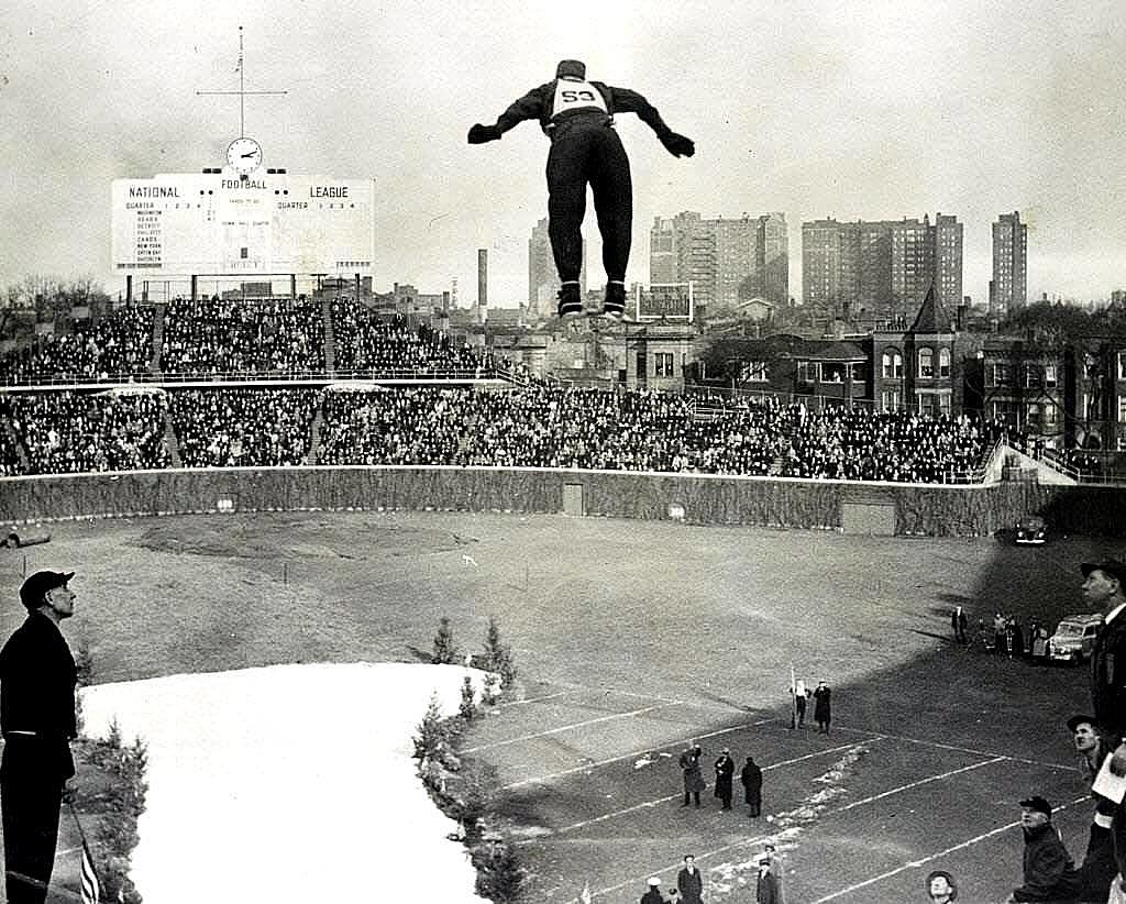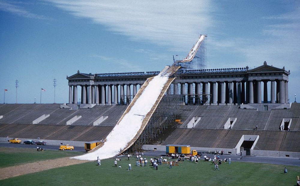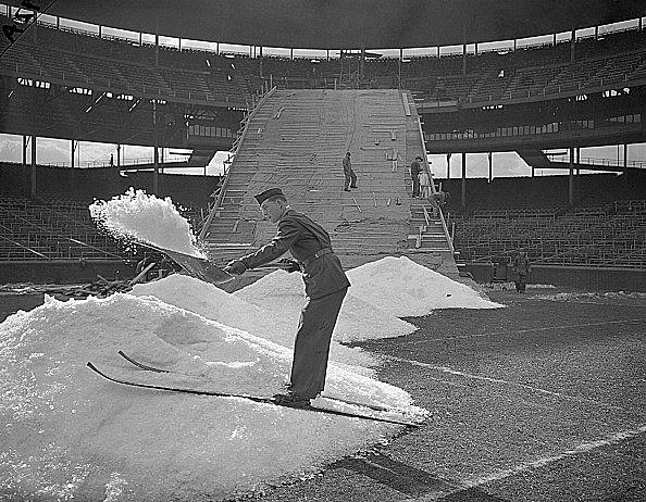There were two events scheduled for that winter, preliminaries and finals, on two consecutive Sundays, January 23 and 30, 1944. According to the Chicago Tribune, the preliminaries were attended by over 6,000 spectators on January 23; while 5,000 made it for the finals on January 30. Until the NHL Winter Classic on New Year’s Day 2009, those were the only two winter sports events ever held at Wrigley. Prior to this event at Wrigley Field, other ski competitions had been held at various locations. Below we see a temporary ski slope built for a long jump competition held at Chicago’s Soldier Field in 1936: