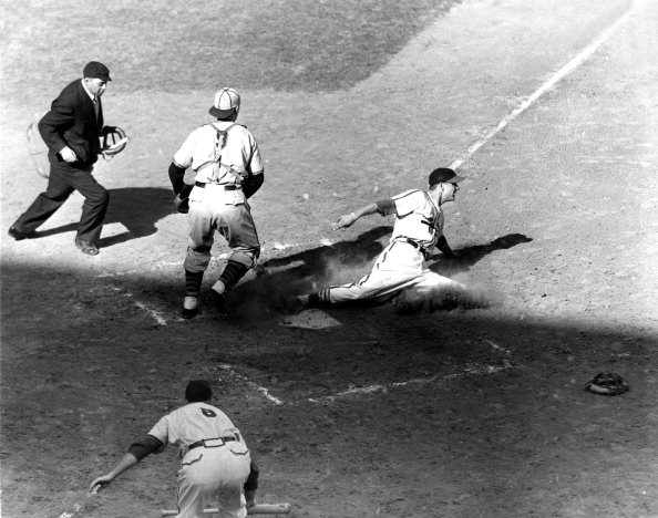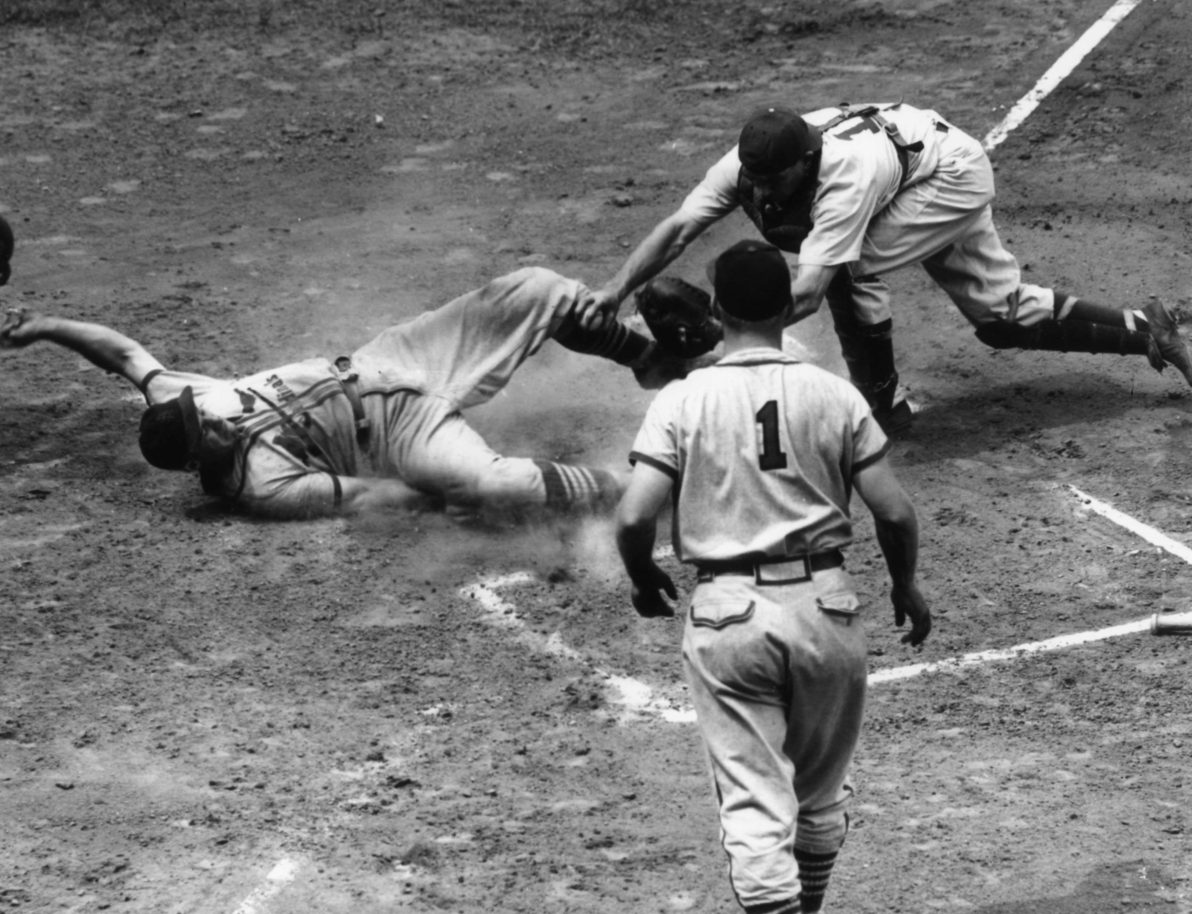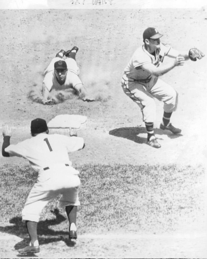 In the great action photo below, we see the Phillies’ Danny Litwhiler sliding safely into Cardinal catcher Walker Cooper. The umpire is HOFer Jocko Conlon. Both players were knocked unconscious on the ensuing collision. This hard slide caught the attention of Cardinal manager Billy Southworth and resulted in Danny being traded from the last-place Phillies to the first-place Cardinals – and two World Series appearances for Litwhiler!