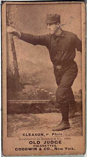 William Jethro Gleason acquired the nickname “Kid” early in life because of his short stature and his energetic, youthful nature. He debuted as a pitcher with the Philadelphia Phillies on April 20, 1888. He enjoyed several successful seasons, including a 38-win season in 1890, and later became the starting second baseman for the famous Baltimore Orioles of Ned Hanlon and John McGraw that won pennants from 1894-96 (although Gleason was traded after the 1895 season).