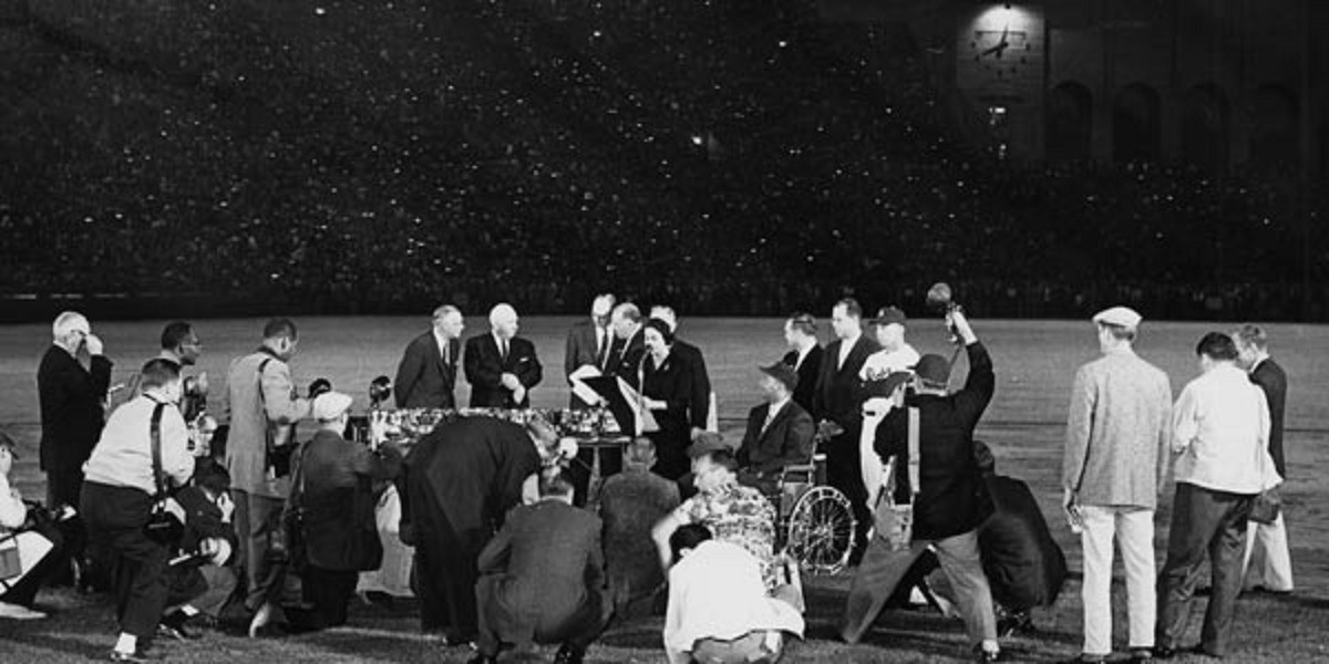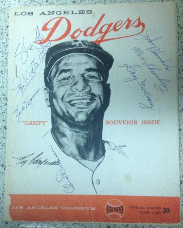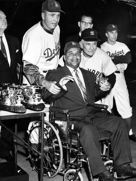 My recent post about Roy Campanella got me thinking about another historic night in Dodger history. Fifty-eight years ago this month, May 7, 1959, a record crowd of 92,103 packed into Los Angeles Coliseum to see an exhibition game played between the Dodgers and the Yankees. The occasion was a benefit game played to honor the Dodgers’ great catcher, Roy Campanella. The eight-time Brooklyn Dodger All-Star was only 36 when a car crash on Jan. 28, 1958 – just days before he was scheduled to leave for Spring Training – left him paralyzed from the shoulders down.