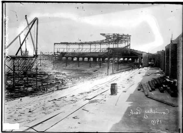 One hundred seven years ago yesterday, February 10, 1907, ground was broken for a modern concrete-and-sheet stadium to replace South Side Park, the obsolete home of the Chicago White Sox. The Sox played their first game at Comiskey Park on July 1, 1910, a 2-0 loss to the St. Louis Browns. Here’s a few words about Comiskey Park’s history. Then join me in a nice photo essay celebrating one of baseball’s great shrines from a by-gone era.